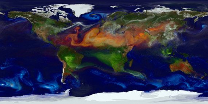 Visualización de una simulación de la dispersión de aerosoles por el viento basada en big data: polvo en rojo, sal marina en azul, sulfatos en blanco y carbón en verde. Créditos: NASA Center for Climate Simulation.