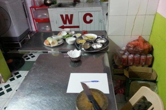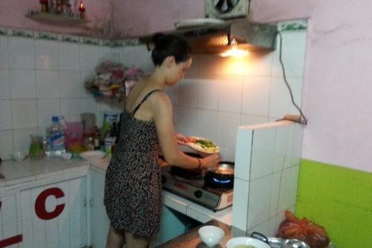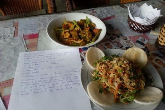 Cuando llego, todos los ingredientes preparados, papel, lápiz y una cocina, ¡yuhuuuu! ¡¡Tengo donde cocinar!! Hago pollo al curry y ensalada de papaya verde, ¡buenísimos! Se cocina también con palillos, como de metal. Mucha verdura y frut...