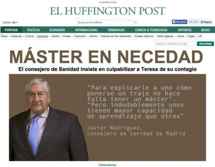 Escuchen al consejero de Sanidad de la Comunidad de Madrid, Javier Rodríguez. No lleva ni un año en el cargo; sustituyó a Javier Fernández Lasquetty tras su fracasado intento de privatización de la sanidad madrileña. Es médico -nefrólogo-, tiene 71 años, presidente del PP en Las Rozas, exconsejero de Telemadrid, diputado regional, y hoy mismo ha dicho en La SER: "Yo llegué a la política comido" y "tengo la vida resuelta", así que "dimitirá" si tiene que dimitir. Intentaba matizar su descarnada afirmación de ayer, cuando dijo -¡a título personal!- que creía que Teresa Romero había mentido al informar de su estado. "Ha sido una expresión desafortunada, pero lo que es cierto es que ella ocultó información", ha remachado hoy. Lo que no ha podido confirmar, ante las insistentes preguntas de Pepa Bueno, es si cuando Romero se quitó el traje de protección había un supervisor en la sala, tal y como establece el protocolo.