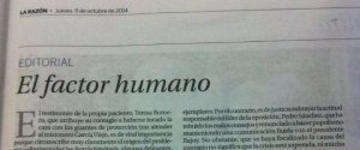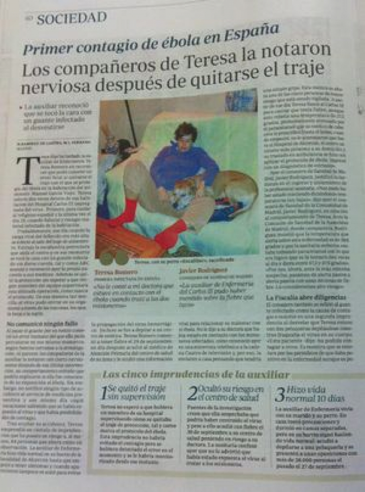 El miércoles hubo una videoconferencia del Comité de Seguridad Sanitaria, con los expertos de los 28 miembros de la UE más la OMS. El Gobierno español lanzó una hipótesis; que la infección se produjera por una posible relajación de los procedimientos, incluida la manipulación del cadáver del segundo misionero fallecido, Manuel García Viejo, o bien por el desecho del material médico. También reconoció cinco casos con alto riesgo de contagio (la doctora de atención primaria de Alcorcón, tres sanitarios y Javier Limón, el marido de Teresa, a los que habría que sumar el doctor Juan Manuel Parra, ingresado ayer.)