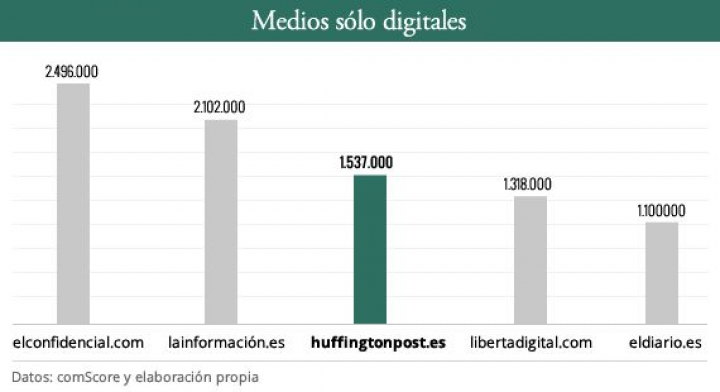 Recién llegada de Huesca, del Congreso de Periodismo Digital -lleva quince ediciones ya, abriendo camino, un punto de encuentro de creatividad y nuevos proyectos-, me espera una pequeña gran noticia; pequeña para el gran público, grande para los que hacemos El Huffpost. Se publican los datos de audiencia del mes de febrero de comsCore, que sitúan a El Huffington Post entre los diez primeros diarios generalistas online de España, y el tercero entre los medios nativos digitales, aquellos que hemos nacido sin el soporte de un medio impreso (por eso no contamos entre ellos a publico.es, que surgió junto a la cabecera en papel ya desaparecida).