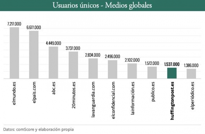 (*) Los datos de comScore mundiales de febrero dan a El Huffington Post un crecimiento del 22,1%, superando los dos millones de usuarios únicos y situándose por delante de Publico.es.
