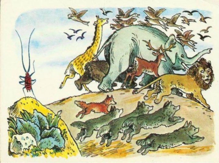 El cuento dice así: "'Traedme a vuestra prole, animales. Hoy os invito a cenar'. Entonces se sientan y se ponen a tiritar entre los arbustos, ocultos bajo las lomas verdes. Lo único que se escucha y se ve es el castañeo de dientes...".