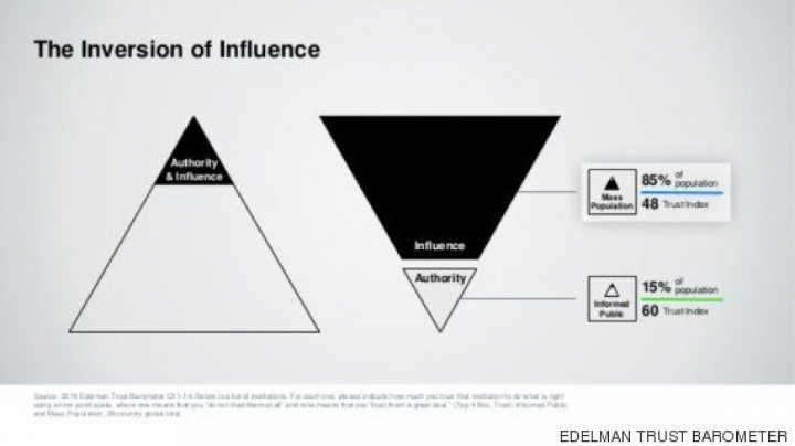 Como muestra el gráfico anterior (del Edelman Trust Barometer), en la encuesta global que se ha realizado en 2016, el 85% del público reconoce tener poca confianza en la autoridad de las élites y de las instituciones públicas y tener más confianza en sus iguales. El 15% restante del "público informado" demuestra un nivel de confianza mucho más alto.