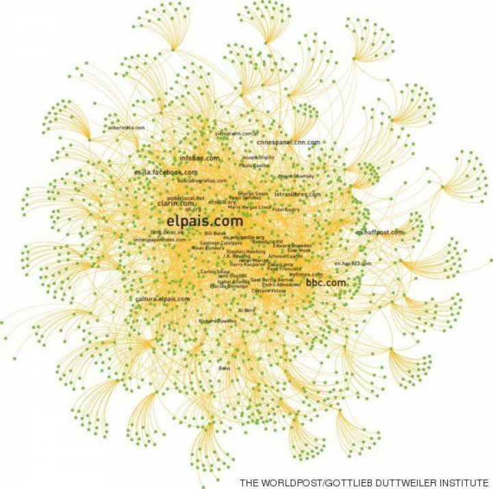 La misión del WorldPost es hacer las veces de puente en un mundo que cada vez es más independiente, pero en el que los medios de comunicación están renacionalizándose e incluso -a través de las redes sociales- convirtiéndose en cajas de resonancia. El mapa de conversación global de este año revela la paradoja, que cada vez cobra más importancia, según la cual la era de la información se está convirtiendo en la era de la no comunicación a través de las barreras ideológicas y culturales. Se dice que internet es un "circuito de pensamiento global". Sigue siendo global, pero se está demostrando que cuanto más dominan las redes sociales el intercambio de ideas, más difícil es integrar y mantener el aspecto del "pensamiento".