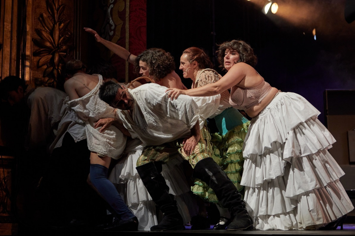 Confusión que se nota más en la primera parte. La dedicada a contar que el teatro era un corral con su cazuela para las damas y las dinámicas que se sucedían en ellos. Que si ahora Lope. Que si ahora una representación. Que si ahora dos damas animándose a ir al corral. Algo que como estrategia para despertar a aquel público que va al teatro a ser un actor pasivo está bien. Pero que al alargarse en demasía, no consigue despertar a estos, y pierde a los que suelen ir al teatro, con una actitud y posición más activas.
