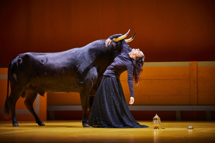 Pues bien, con todos esos gremios que se mete, están hiperrepresentados en el patio de butacas. Y en vez de levantarse e irse, le ríen las gracias, no todos que hay quien la mira tan arrobado y extasiado que parece que se les ha aparecido la Virgen. Todos le dedican un gran aplauso final. Y, siguiendo con la metáfora de la obra, de que se está en una corrida de toros, le darían las dos orejas y el rabo de ese inmenso toro a tamaño real que pone en escena y al que torea porque es de atrezzo que sino ya veríamos. Una belleza de toro, por cierto.