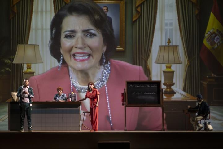 En este sentido, sobra la plataforma que sube y baja, una de las veces para que cuelguen solo unos aros de gimnasio. O esa compleja reproducción del montaje posdramático de La casa de Bernarda Alba que puso en escena Calixto Bieto que poco o nada dirá al público masivo al que va dirigida. O el uso tan azaroso de las proyecciones, exceptuando los videos con las intervenciones presidenciales de Silvia Abril.