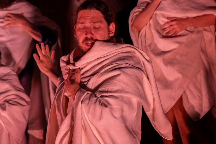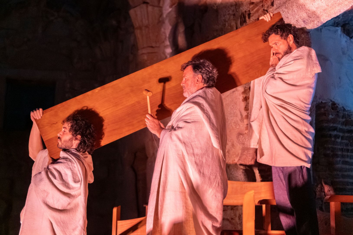 Siguiendo a este elenco, que lidera a los pocos afortunados espectadores, se va pasando por distintos espacios o parándose delante de distintos huecos en los que suceden escenas que recuerdan cuadros de temas bíblicos. Como la última cena, la crucifixión de Cristo y su resurrección.