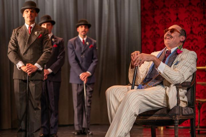 A todo ello se podrían añadir algunas acertadas notas de dirección, de puesta en escena, de Juan Carlos Pérez de la Fuente. Que abusa de la salida y entrada por el patio de butacas de personajes, ampliando la ya de por sí la gigantesca embocadura de este teatro, o de los abrazos que tiende a dar un personaje y la cojera de otro, lo que agota su efectividad escénica. Sin embargo, usa bien los elementos coreográficos que tanto le gustan y para los que ha contado con uno de los mejores, Guillermo Weickert. Tanto, cuando son evidentes, como el baile que hay en la función, como cuando no lo son tanto, que es el caso de la forma sigilosa y sibilina en la que se mueve el Guasa Club a las órdenes de Tito Guiloya, su líder que interpreta Críspulo Cabezas con la eficacia que lo hace todo el elenco.
