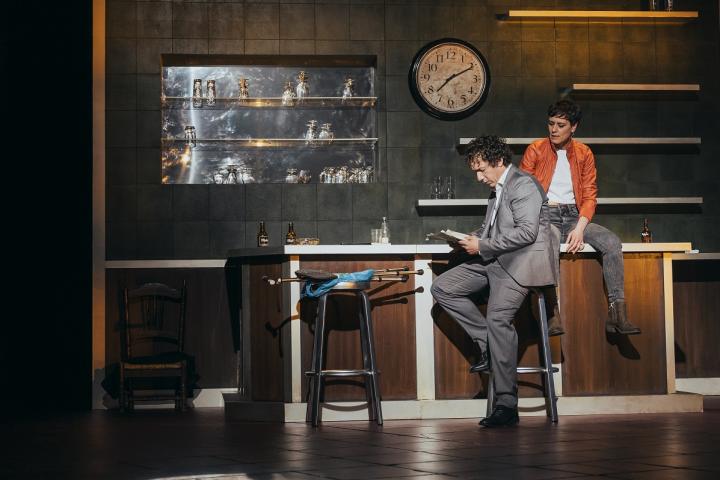 Como no lo hay en un bar de barrio oliendo a fritanga. Por eso asombra que en esa fealdad la escenógrafa Beatriz San Juan haya sabido sacar belleza. Algo que ha hecho combinando cajas de plástico de distintos colores, de esas que se usan para distribuir las botellas de cervezas y refrescos, apiladas en una pared. Colocándolas e iluminándolas de una manera que por momentos parecen el skyline de una gran ciudad cualquiera. Como la que se ve desde los barrios de la periferia. Y, ya que el que dirige es del cine, se podría decir que es como Manhattan visto desde Brooklyn.