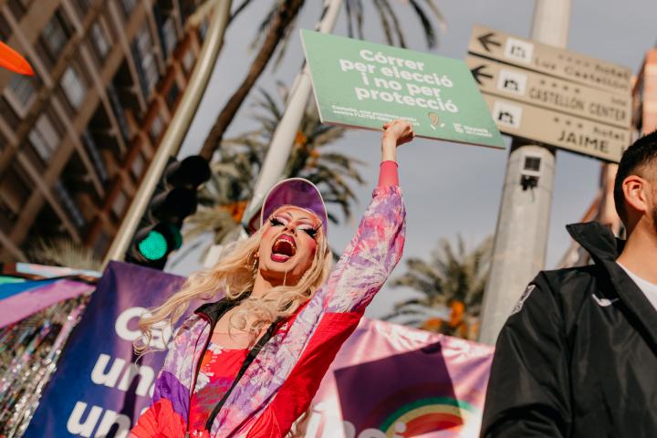 Por supuesto, el kilómetro arcoíris fue todo un éxito. Se acercaron familias enteras a por aplaudidores, piruletas y pulseras contra la LGTBI-fobia. Querían bailar, reír, tomarse fotos en el km. arcoíris y aplaudir a los corredores con nosotres. En el punto de animación diverso estábamos Damián López, deportista y entrenador del primer club de taekwondo LGTBI federado del mundo, las drags Niña Delantro y Fitta, los djs de Oz Esto no es Kansas, el pub LGTb de Castellón, y yo misme. Recuerdo especialmente un momento en el que una abuelita muy emocionada se acercó a saludar a la Niña Delantro porque, además de drag, es la monitora del gym de la señora. El caso es que fue un exitazo que marcará un antes y un después porque el kilómetro arcoíris de Castellón ha sido el primer punto de animación LGBTQ+ de una maratón en España.