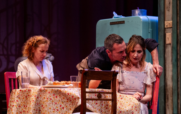 Y, aunque por un lado parece que hay demasiado, por otro parece que falta algo o mucho. ¡Qué contradicción! Como al gigantesco armario colocado en escorzo al que le falta un cajón. O como ese cuarto de baño que ocupa casi un tercio del escenario, desde el que hablan los personajes, pero sin que se vea que hacen. ¿No hubiera sido más eficaz teatralmente ponerlos entrecajas?