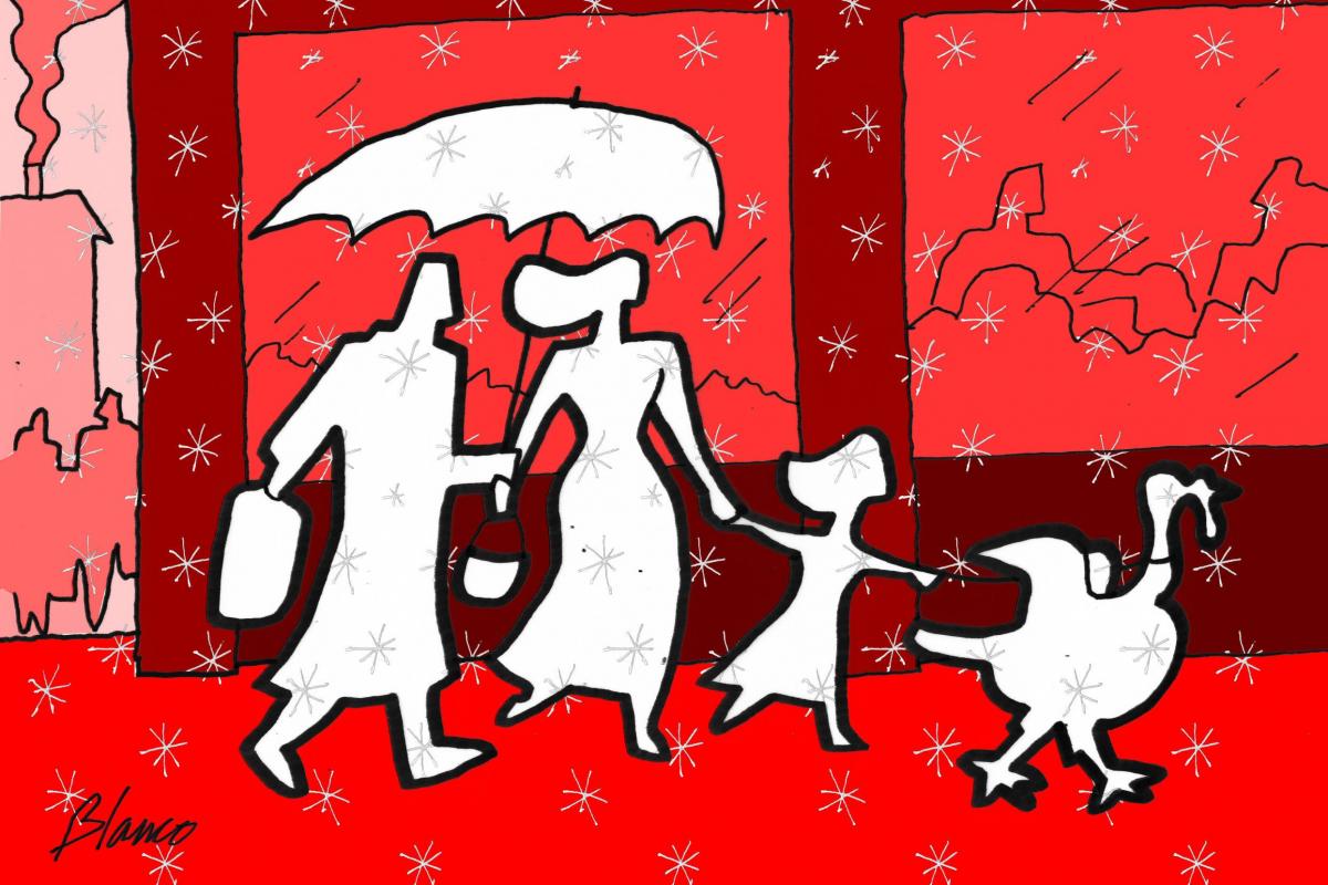 Por entonces, aquellos pavos se vendían vivos, y los compradores debían encargarse de terminar con sus vidas para cocinarlos. La abuela, en el pueblo de Galicia del que procedía, había aprendido a hacerlo. Ahí van: mi madre y la abuela, de casa al mercado, muy abrigadas (gorros, bufandas, guantes, leotardos), contentas, tal vez resguardadas de la lluvia bajo el enorme paraguas del abuelo. Puedo verlas, de la mano, mientras ella, mi madre, me cuenta de nuevo la historia.