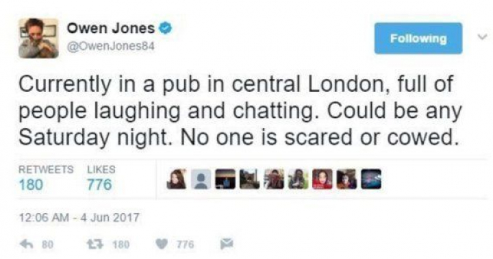 Cuando se dio la noticia, publiqué varios tuits. Uno de ellos decía así: "En un pub en el centro de Londres, lleno de gente que charla y se ríe. Podría ser cualquier noche de sábado. Nadie está asustado ni intimidado".