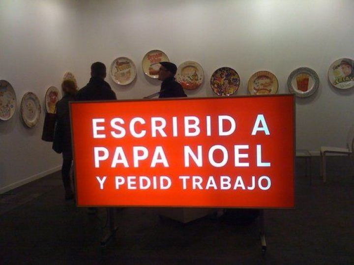 Eso sí, hay que señalar que el paisanaje de Arco se ha renovado. Ya no vienen algunos de los habituales de antaño. Con tanta gente arruinada o al menos venida a menos; con tanto coleccionista que ya no puede coleccionar; con tanta clase media que ahora necesita el dinero para pagar la hipoteca y comer todos los días o tanto artista que ya no vende ni un cuadro, la mitad de las caras de antes han desaparecido. Entre la crisis, el paro y el IVA cultural al 21% (según afirman algunos galeristas, no es cierto que se haya reducido al 10%, esto es sólo para las ventas directas de artista a cliente, sin intermediarios), este Gobierno le está dando la puntilla al arte (y, por lo tanto, a su comercio) como antes hizo con el teatro, el cine y todo lo que huela a cultura y/o educación. No hay que olvidar que el arte lo compran la clase media y los ricos, pero lo producen y lo venden artistas, personas que generalmente malviven precariamente de su trabajo. Incluso muchos de ellos pobres de solemnidad, o sea, que no se trata de un asunto de ricos sino más bien al contrario; aunque la imagen que ofrece el producto final sea tan brillante, los estudios donde viven y trabajan son, demasiado a menudo, la cara opuesta.