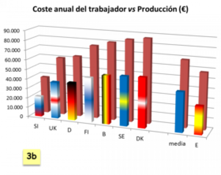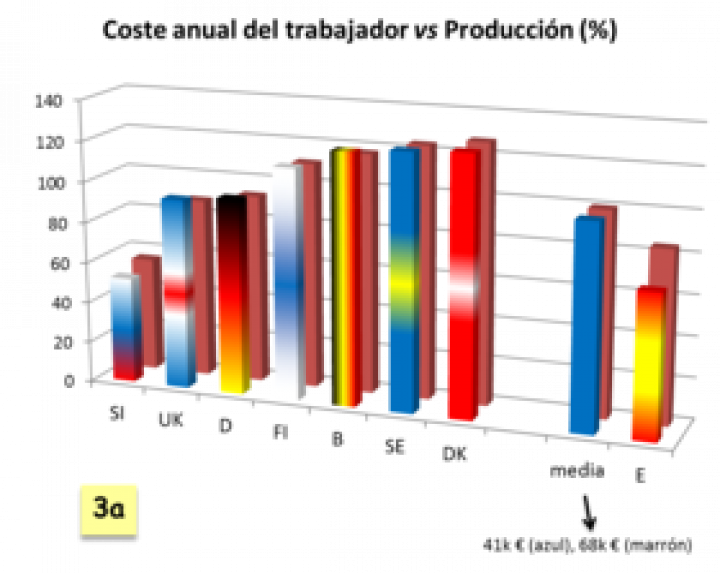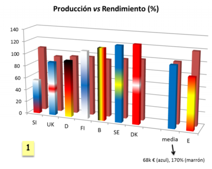 Una trabajadora española produce unos 64.000 € al año brutos. Esto está, efectivamente, un poco por debajo de la media, aunque dentro del rango "normal" (fig. 1, banderas). Sin embargo, la productividad bruta, es decir, lo que cada persona aporta al PIB, no es muy relevante; lo que importa es la neta, también llamada rendimiento (marrón), es decir, lo que produce menos lo que cuesta. Ahí somos campeones absolutos, muy por encima de la media. Esto ya no está en el rango normal, es lo que se conoce como un dato aberrante. Otra cosa que vemos en esta figura es que un aumento de la producción no repercute en el rendimiento. Por ejemplo, en España y Eslovenia conseguimos unos rendimientos altísimos produciendo muy poco, mientras que en Dinamarca es al revés. Entonces, ¿somos unos genios?