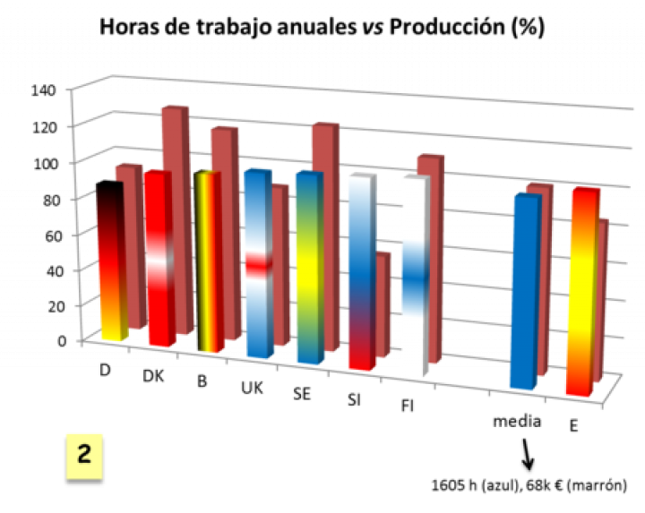 Para saberlo, hay que averiguar de qué depende la producción bruta. El sentido común nos dice que cuantas más horas trabajemos, más produciremos. Pero la realidad (fig. 2) nos muestra que nada tiene que ver una cosa con otra. De nuevo, España vuelve a batir el récord: somos los más pringaos, con diferencia. De genios, nada. Aquí cabría preguntarse cómo se mide la producción: la creación de tejido social, por ejemplo, o la protección del medio ambiente, no computan, ya que son difíciles de medir. Pero ese es otro tema.