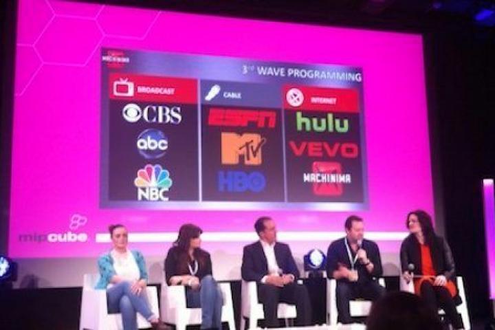 Phillips explica que la tercera generación de la televisión ya está aquí y lo ilustra con esta diapositiva: la primera ola es la televisión de las grandes networks CBS, ABC y NBC que utilizan la transmisión broadcast o u ondas hertzianas. La segunda es la de la generación MTV, la televisión por cable (o satélite), también HBO y ESPN. La tercera es la de la de internet, y como no puede ser de otra manera indica su empresa Machimina de la que es presidente, junto a Hulu y Vevo. Otros hubieran indicado Youtube o Netflix.