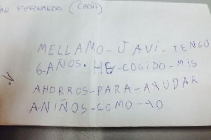El año pasado, en la primera edición de esta preciosa campaña "Ayúdales a volver al cole. Llena sus mochilas de ilusión", Javi, un niño gaditano nos regaló una hermosa historia. Junto a unos cuadernos y bolígrafos que nos mandó había puesto un papelito en el que contaba que había roto su hucha para ayudar a niños como él. Esa carta de Javi está enmarcada y colgada en una pared junto a mi mesa de trabajo. Es toda una lección de un pequeño de siete años. Una lección magistral.
