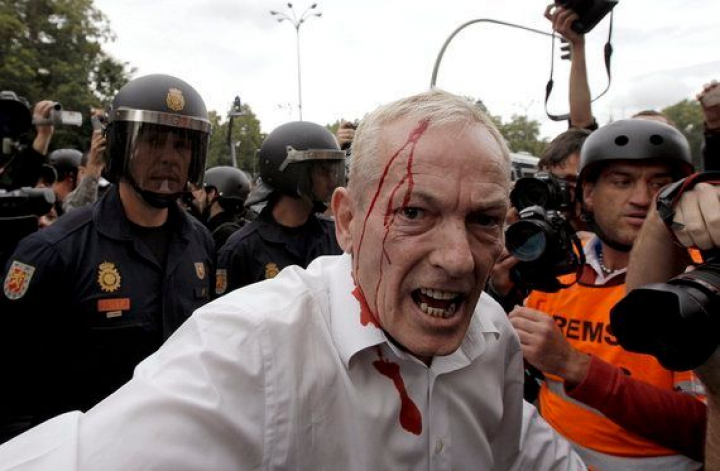 Vivimos en un mundo dominado por las nuevas tecnologías (en esta ocasión, benditas sean), además de múltiples cámaras profesionales (impresionante verlos trabajar en el centro mismo del seísmo, a la manera de los reporteros de guerra. Admirable el testimonio que han dejado, tanto por su valor moral como artístico) la mayoría de los manifestantes portan además de gritos y eslóganes muy certeros ("Roban, pegan, no nos representan") una cámara de fotos o un simple teléfono, cuyas imágenes no verán la luz en TVE pero uno puede contemplarlas en otros medios digitales, o en YouTube. En esas imágenes podemos ver con toda nitidez la porra, absolutamente real, de un policía enmascarado, (todos lo están, excepto algún infiltrado, que también los hubo y también hay testimonio de ello), y el rostro descubierto de su víctima, pálido, con una brecha en la cabeza, una brecha tan real que mana abundante sangre que a su vez resbala por las mejillas de la víctima y le salpica la camisa. Sangre roja, documentada, narrada por cualquiera de los asistentes al "acto".