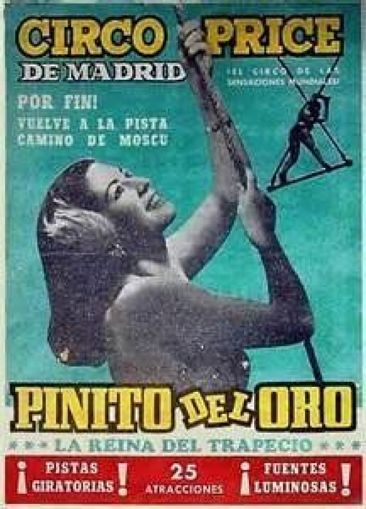 Un tambor redoblando fue el preludio de la presentación de una artista que arremolinó a cuantos esperábamos entre cajas. Mis padres me dijeron que era Pinito del Oro, la gran trapecista, que había venido de América, del Circo de los Ringling Brothers. Aquella mujer subió por una escala a un trapecio, allá arriba, sin red, con una silla en la mano. Cuando estuvo a su altura se situó en la barra y mostró la silla que llevaba. Se hizo un silencio físico, nada existía salvo ella, el trapecio y la silla. Todos: Don Jaime, Mary Santpere, Ángel de Andrés... todos contenían la respiración ante el prodigio de Pinito sentada en la silla que reposaba dos de sus cuatro patas sobre la superficie imposible de la barra del trapecio.