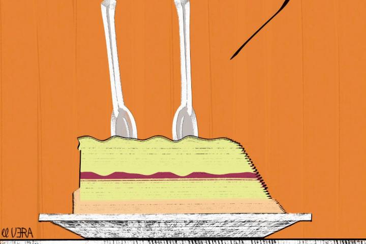 Ya no existen dos cucharillas clavadas sobre la tarta, ahora son más. Aumenta el número de comensales para el mismo plato. Postre cremoso por arriba para que las finas cucharillas entren fácilmente hacia el sabor. Minimizando en lo posible la inesperada, pero indiscutible, dureza de su base.