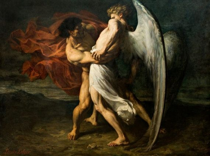 Arriba: dos héroes enfrentados en Batman v. Superman: El amanecer de la justicia (Zack Snyder, 2016), © Warner Bros. Entertainment Inc. Abajo: Jacob luchando con el ángel (Alexander Louis Leloir, 1865), © Musée d'art Roger-Quilliot à Clermont-Ferrand.
