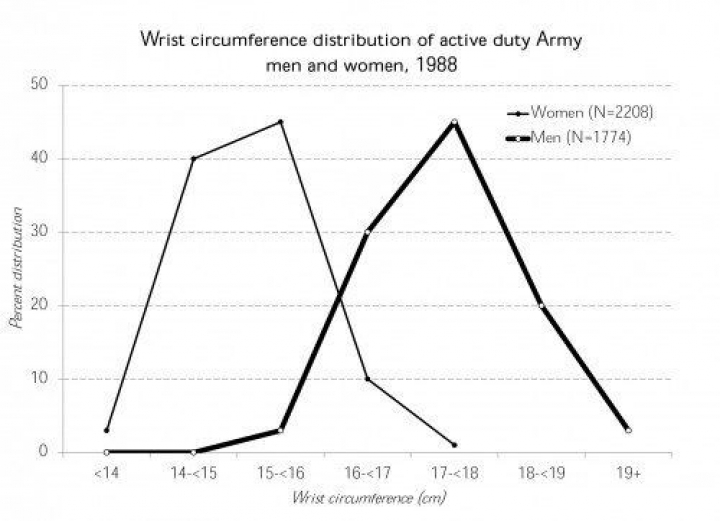 ¿En qué se diferencian las muñecas de los hombres y las mujeres reales? He analizado siete trabajos que van desde el síndrome del túnel carpiano hasta el dominio del judo, y he observado que la media para las mujeres está entre 15,4 cm y 16,3 cm, y para hombres, entre 17,5 y 18,1 cm (en ambos casos, los del equipo de judo tenían las muñecas más grades).