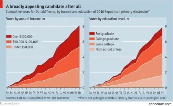 Así las cosas, ¿quienes son los votantes de Donald Trump?. Pese a que el común de los mortales cree que son blancos, de clase baja, con pocos ingresos - lo que la progresía denomina White trash (basura blanca), una encuesta de The Economistde la semana pasada asegura todo lo contrario.