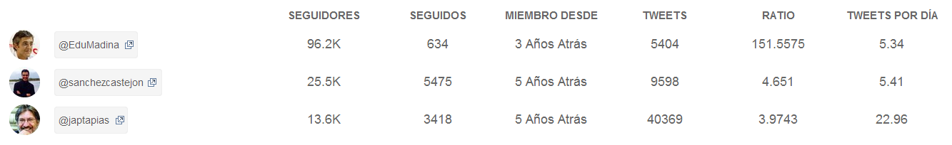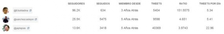 @JapTapias es de los tres, el más tuitero por volumen y crecimiento de su comunidad. Cuida mucho su cuenta de Twitter desde hace años, mientras que, según las estadísticas, @EduMadina y @SanchezCastejon tienen una actividad mucho más intensa desde el anuncio de sus candidaturas.