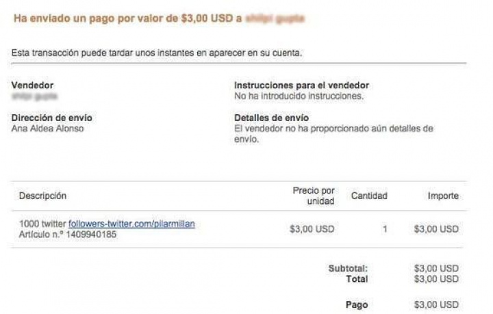 Lo primero que hemos hecho ha sido comprar followers para demostrar que, efectivamente, solo necesitas el nombre del usuario y una tarjeta de crédito para "regalar" followers a quien quieras. Amigos, o enemigos.