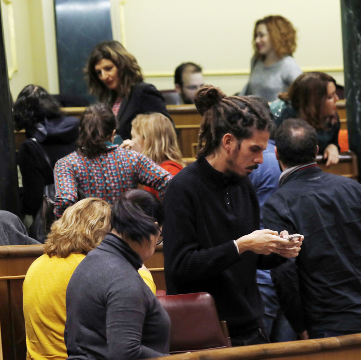 A los diputados de Podemos, la noticia de Barberá les ha pillado con unos cuantos de sus diputados fuera (como a todos a las 9 de la mañana, pero ese es otro tema). Ha sido el portavoz Íñigo Errejón quien ha hablado con el del PP, Rafael Hernando y José Luis Ayllón -secretario de relaciones con Las Cortes- antes de tomar la decisión de abandonar el hemiciclo cuando Ana Pastor ha comunicado que se iba a guardar el minuto de silencio. Cuentan los diputados populares que Errejón ha salido precipitadamente para evitar que las cámaras le inmortalizarán al frente de su grupo abandonando el hemiciclo.
