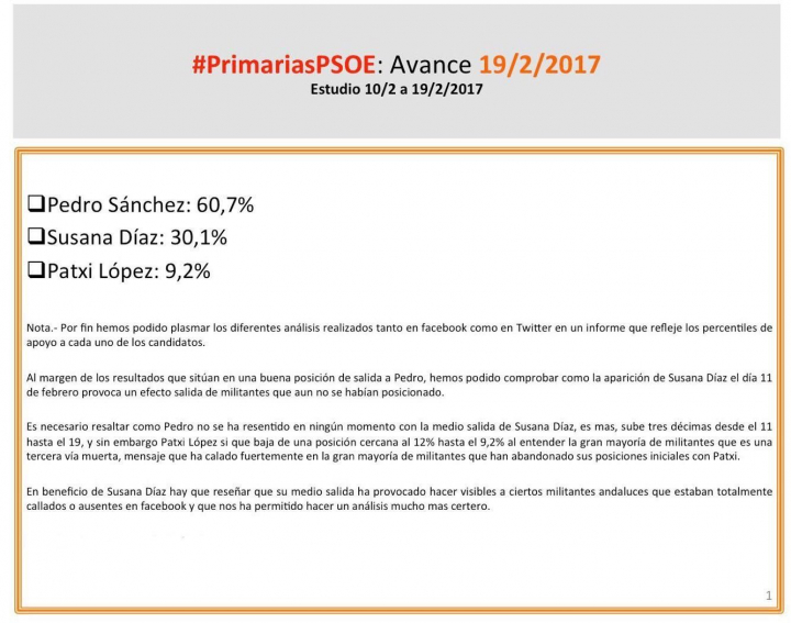Los datos van en la misma línea que los encargados por los susanistas para testar el apoyo de la militancia andaluza, que arrojarían un apoyo a Pedro Sánchez que "ni él mismo soñaría", según ABC de Sevilla. El estudio de los críticos con la Gestora añade que "Pedro no se ha resentido con la media salida de Susana Díaz el 11 de febrero. Es más, sube, sube tres décimas desde el 11 de febrero, día del mitin de la presidenta andaluza con los alcaldes".