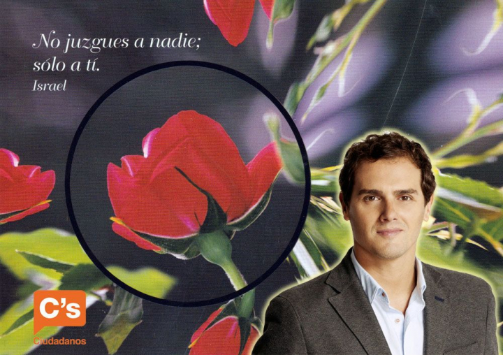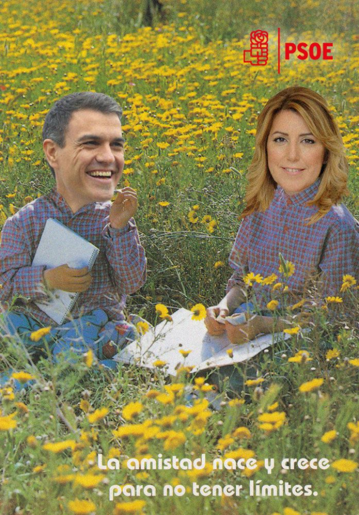 Fue ver el cartel del rostro de Pedro Sánchez fundiéndose sobre un campo de amapolas y flores silvestres y salir corriendo a la librería religiosa San Pablo, como si nosotras también hubiéramos entrado en trance espiritual. Hemos querido imaginar cómo sería la campaña si los demás partidos se contagiaran de tan pastoril iconografía.
