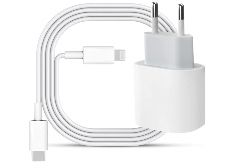 Cargador rápido para iPhone en color blanco, que viene con cable y se conecta a la pared. Cuenta con un suministro de energía de PD 3.0 y una compatibilidad de USB-C.
