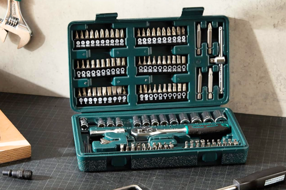 Incluye juegos de llaves de vaso y puntas para destornillador, de distintas medidas y para distintas tareas. Así, con las herramientas de este maletín se pueden realizar multitud de trabajos de bricolaje, reparar muebles de casa, piezas del coche o de la moto, ¡y más! Estas son todas las herramientas que encontrarás: