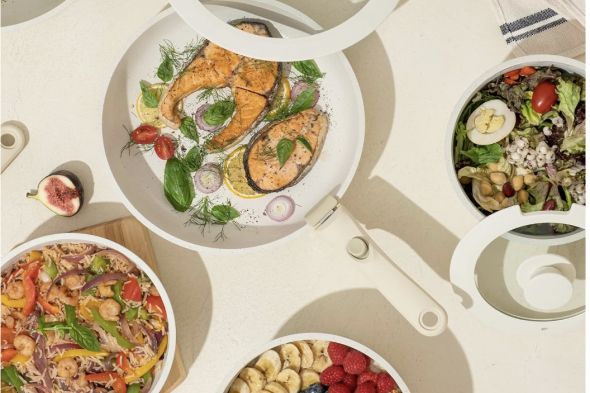 Para empezar, esta batería de cocina es la más vendida en Amazon y no es una casualidad. Además de por su diseño y su color, las reseñas destacan que sus sartenes y ollas no pesan, funcionan muy bien en las cocinas de inducción y ahorran espacio porque, gracias a su mango extraíble, se apilan perfectamente.
