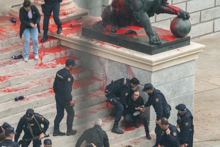 Detenidos ocho activistas climáticos tras teñir de rojo la fachada y un león del Congreso