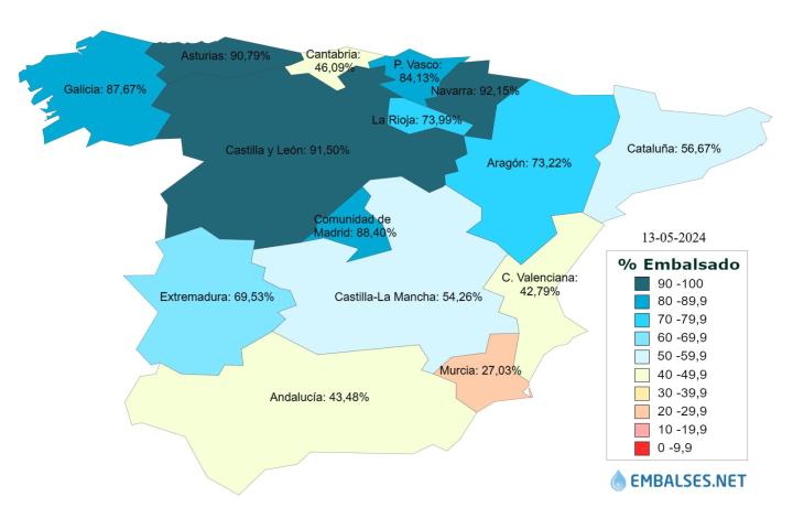 La comunidad que se encuentra en la situación más crítica es la Región de Murcia, donde los embalses se encuentran al 27,03% de su capacidad. Le sigue la Comunidad Valenciana (42,79%), Andalucía (43,48%), Cantabria (46,09%) y Castilla-La Mancha (54,26%). En la situación opuesta se encuentran Navarra (92,15%), Castilla y León (91,5%) y Asturias (90,79%).