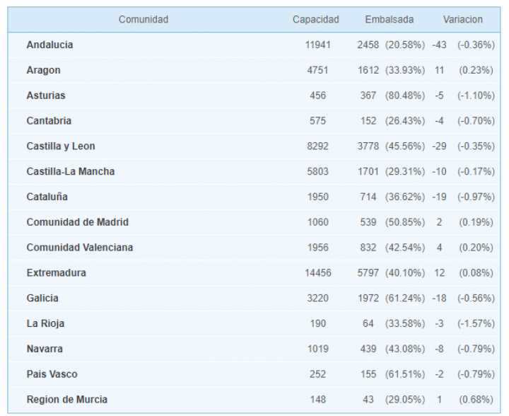 Por todo ello, según los datos aportados, las lluvias de las últimas semanas han tenido un impacto insuficiente y en muchos casos casi imperceptible. La Comunidad Autónoma que registra un mayor porcentaje de agua embalsada es Asturias, cuyos pantanos se encuentran al 80% de capacidad, un 20% más que en la misma semana del pasado año.