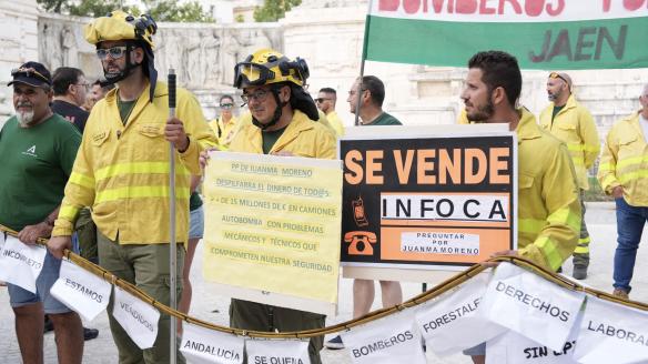 Bajo el lema "Infoca no se vende, se lucha y se defiende", bomberos forestales de la provincia de Cádiz se han concentrado este miércoles ante la sede de la Junta de Andalucía en la Plaza de España de la capital gaditana para denunciar la precariedad laboral del colectivo.