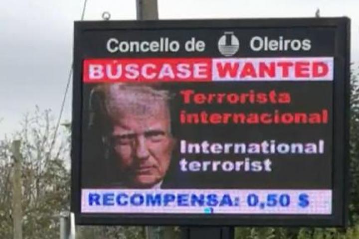 No son los 50 millones de dólares de recompensa que el Gobierno de Estados Unidos ofrece por información que permita la detención del presidente de Venezuela, Nicolás Maduro, pero algo es algo, o al menos eso han debido pensar en el Ayuntamiento de Oleiros. El municipio gallego, gobernado por Alternativa dos Veciños, ha ofrecido una módica recompensa de apenas 0,50 dólares por Donald Trump, a quien tildan de "terrorista internacional", según se puede ver en las pantallas digitales de la ciudad.