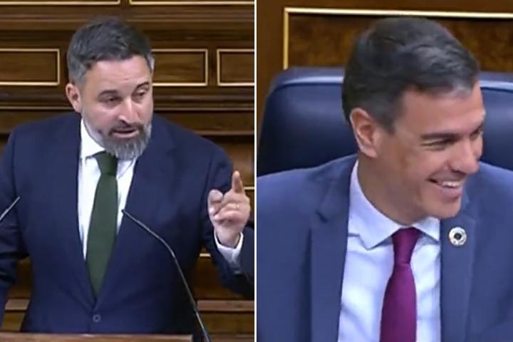 El presidente del Gobierno, Pedro Sánchez, no se ha aguantado la risa, después de que el líder de Vox, Santiago Abascal, hiciera una matización de una de sus afirmaciones desde la tribuna del Congreso de los Diputados.