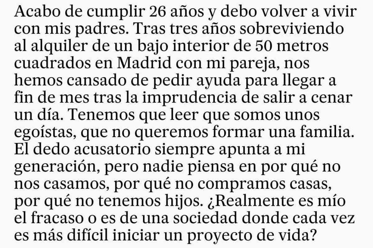 "Acabo de cumplir 26 años y debo volver a vivir con mis padres. Tras tres años sobreviviendo al alquiler de un bajo interior de 50 metros cuadrados en Madrid con mi pareja, nos hemos cansado de pedir ayuda para llegar a fin de mes tras la imprudencia de salir a cenar un día. Tenemos que leer que somos unos egoístas, que no queremos formar una familia. El dedo acusatorio siempre apunta a mi generación, pero nadie piensa en por qué no nos casamos, por qué no compramos casas, por qué no tenemos hijos ¿Realmente es mío el fracaso o es de una sociedad donde cada vez es más difícil iniciar un proyecto de vida?"