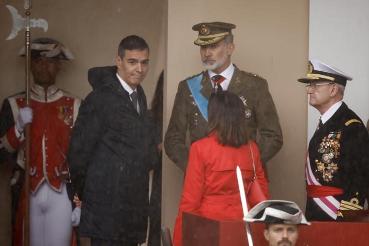 Puntuales, como siempre, a las 11 horas en la Plaza de Neptuno de Madrid, aparecían los reyes junto a la princesa Leonor, donde aguardaban los presidentes autonómicos, y un pequeño corrillo formado por la titular de Defensa, Margarita Robles, el alcalde de Madrid, José Luis Martínez-Almeida y la presidenta madrileña, Isabel Díaz Ayuso ante un Sánchez, que, tres minutos antes de la llegada de los monarcas saludaba con notables diferencias. La mano para los cargos populares y dos besos a su ministra. Desde entonces, todo deslucido por la lluvia, que ha obligado a suspender el desfile aéreo acortando notablemente su duración.