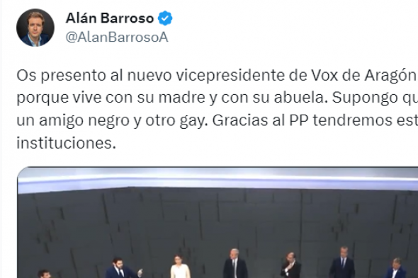 Barroso, cuyo comentario ha reventado el megustómetro de Twitter con más de 3.400 likes y más de 1.000 retuits a las pocas horas ha puesto los puntos sobre las íes al representante de la extrema derecha. "Os presento al nuevo vicepresidente de Vox de Aragón. No es machista porque vive con su madre y con su abuela.", ha empezado Barroso.