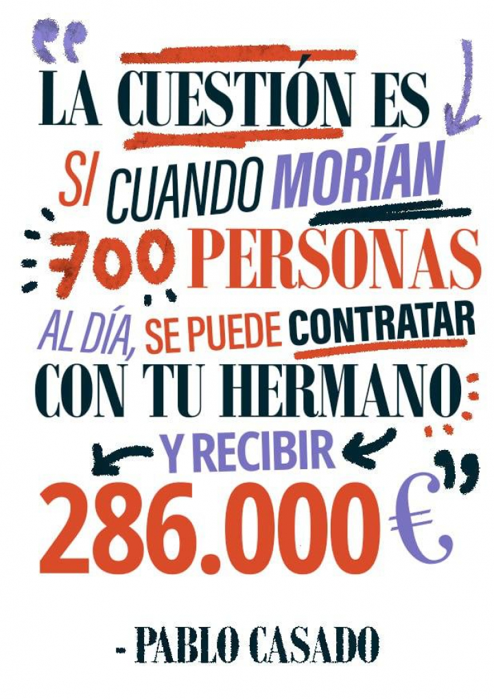 Junto a la cara del hermano de Ayuso, el mensaje recrea el famoso tuit de Pablo Casado, expresidente del PP, sobre este caso: "La cuestión es, si cuando morían 700 personas al día, se puede contratar con tu hermano y recibir 286.000 euros".