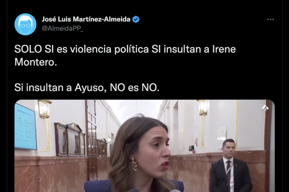 En contraposición, Almeida ha rescatado el término "violencia política", empleado habitualmente por los de Podemos, para cargar contra la de Igualdad: "SOLO SI es violencia política SI insultan a Irene Montero. Si insultan a Ayuso, NO es NO".