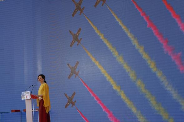 La presidenta madrileña afea también la ausencia de las Fuerzas Armadas, motivo por el cual ha vetado al Gobierno. El PSOE acusa a la líder regional de haber montado un "mitin" en Sol.